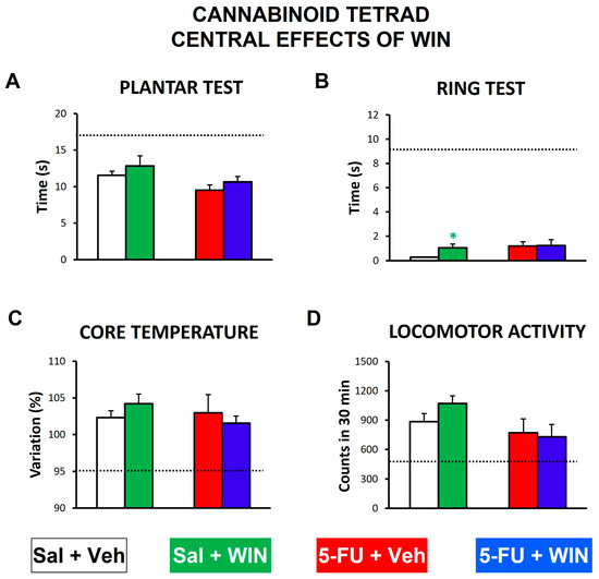 Figure 6. Central effects of the cannabinoid agonist WIN 55,212-2 systemically administered in the rat. Cannabinoid central effects were evaluated using the cannabinoid tetrad: (A) plantar test (for antinociception); (B) ring test (for catalepsy); (C) core temperature (for hypothermia); (D) locomotor activity (for hypolocomotion). Tests were performed as described in the text. At 15 days after saline (Sal) or 5-fluorouracil (5-FU, 150 mg/kg, ip) administration, WIN 55,212-2 (WIN, 1 mg/kg, ip) or its vehicle (Veh) were administered, and the cannabinoid tetrad was performed 20 min after. Bars represent mean ± SEM. N = 8 animals each group. * p < 0.05, vs. Sal+Veh (one-way ANOVA followed by Bonferroni’s post-hoc test). Dotted lines indicate the values of reference obtained in each test by a higher, psychoactive dose of the cannabinoid (WIN 5 mg/kg [32]).