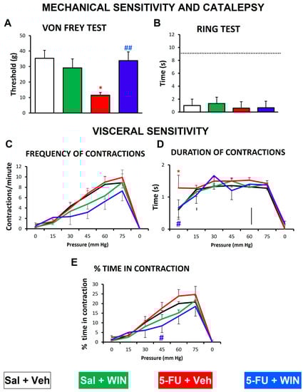 Figure 7. Effect of the antitumoral drug 5-fluororuacil and/or the cannabinoid agonist WIN 55,212-2 on responses to intracolonic mechanical stimulation in the rat. After 5 days of saline (Sal) or 5-fluorouracil (5-FU, 150 mg/kg, ip) administration, the rats were injected with WIN 55,212-2 (WIN, 1 mg/kg, ip) or its vehicle (Veh). Mechanical sensitivity and catalepsy were evaluated using the von Frey test (A) and the ring test (B), respectively, 20 min after injections. Then, the animals were prepared for the evaluation of visceral sensitivity by inserting in the colon a balloon connected to a sphygmomanometer, which allowed for mechanical intracolonic stimulation (see text). A tonic stimulation protocol was used: pressure was increased from 0 to 75 mmHg, in steps of 15 mmHg every 5 min, to finally return to 0 mmHg again; each pressure stimulus was applied only once and maintained for 5 min. The number of abdominal contractions per minute (C), the average duration of the abdominal contractions (D) and the % of time in contraction (E) were measured. Data represent the mean ± SEM. N = 8 each group. * p < 0.05 vs. Sal+Veh; # p < 0.05; ## p < 0.01 vs. 5-FU+Veh (one or two-way ANOVA followed by Bonferroni’s post-hoc test). The dotted line in (B) represents the value of reference obtained in the ring test by a higher, psychoactive dose of the cannabinoid (WIN 5 mg/kg [32]).