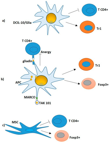 More recently, Passeri et al. [96] demonstrated that human DCIL10/glia, generated by genetic engineering of monocytes with lentiviral vectors co-encoding for immunodominant gliadin-derived peptides and IL-10, inhibit pathogenic gliadin-specific CD4+ T cells and promote the differentiation of gliadin-specific Tr1 cells (Figure 2a) in PBMCs from HLA-DQ2+ CeD patients [96].