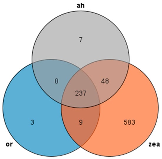 Venn diagram of AP2 gene family: or (rice), zea (Zea mays), and ah (Arabidopsis thaliana) are all in different colors.