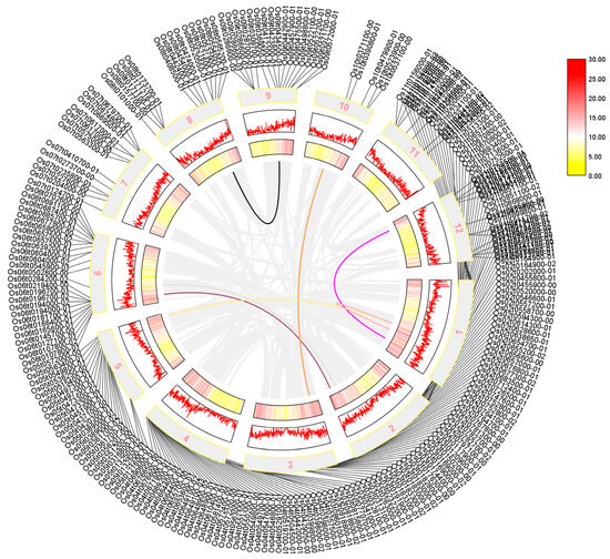 The collinearity analysis of the rice AP2 gene family is presented in a diagram where the outer circle shows the screened transcripts. The mid-term numbers represent the corresponding chromosomes, and rice tandem repeat genes are shown as gray lines in the figure. The tandem genes of the rice AP2 gene family are represented by the colored lines. Legend in Figure 3 represents the relative density of genes on chromosomes.