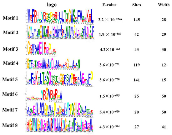 We performed a gene family analysis of the 273 similar AP2/EREBP family members obtained via a Venn diagram. Our analysis revealed that most of the AP2 family members contained eight different conserved sequences, with motif 1, motif 4, and motif 5 appearing multiple times in the sequences (Figure 4). These motifs may be important for the AP2 family to perform functions. Furthermore, our analysis of the conserved domains of the AP2 family identified 17 conserved domains. In Figure S1, we also identified 27 transcripts containing the AP2 domain, four transcripts belonging to the RAV family, and 31 transcripts containing a conserved B3 domain [47].