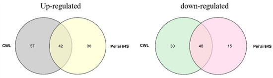 The expression of AP2/EREBP family genes of Chaling wild rice and Pei’ai 64S were analyzed by using Affymetrix array technology. As shown in Figure 5 and Figure 6, after cold stress, the expression of 42 genes increased in both Chaling wild rice and Pei’ai 64S, 15 genes only increased in Chaling wild rice after cold stress, and 30 genes only increased in Pei’ai 64S. The expression of 48 genes decreased in both Chaling wild rice and Pei’ai 64S, 30 genes decreased in Chaling wild rice, and 15 genes decreased in Pei’ai 64S. These results indicate that AP2 family genes play roles in the regulatory pathway in the cold stress in both wild rice and cultivated rice. Although the AP2 family genes play a regulatory role in the cold stress of wild rice and cultivated rice, their expression levels are different. As shown in Table 1, the total growth rate of 37 genes is higher in Chaling wild rice than that of cultivated rice in cold stress. Os01g21120 is the largest increase rate gene in Chaling wild rice, which has increased 54 times at low temperatures, but only 18 times in Pei’ai 64S. An asterisk indicates that the increase rate in Chaling wild rice is higher than that in Pei’ai 64S. We analyzed the sequence of the different expression AP2 genes in the transcriptome (Figure S2) and found that it contains three major conserved sequences and that most of the genes in its gene sequence contain AP2 and B3 structural domains. And we analyzed the AP2 gene family and found that most of the genes in the AP2 gene family contain AP2 and B3 conserved structural domains, indicating that the gene sequence in the transcriptome is related to the AP2 gene family.