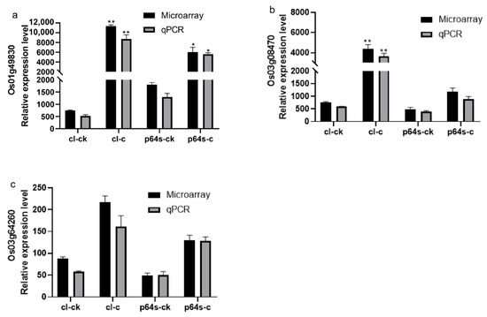 The expression of genes Os03g08470, Os01g49830, and Os03g64260 under cold stress is presented in a diagram. The gene expression levels are represented by the ordinates and cl-ck, p64s-ck denotes Chaling wild rice and Pei’ai 64S under normal conditions, whereas cl-c, p64s-c denotes Chaling wild rice and Pei’ai 64S under cold stress. The error bars in the figure represent the mean ± standard error, * represents the difference, p < 0.05, and ** represents the significant difference, p < 0.01. (a) The gene expression of Os01g49830. (b) The gene expression of Os03g08470. (c) The gene expression of Os03g64260.