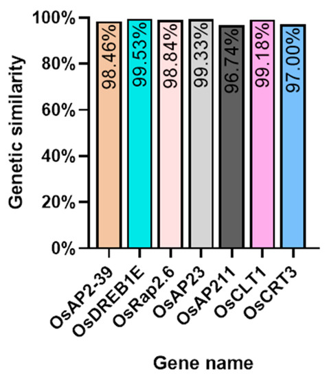 We investigated several elements of the signaling pathway that respond to the AP2 family in Oryza sativa, including OsAP211, OsAP2-39, OsDREB2B, OsRap2.6, and other gene families. Our analysis revealed that the overall conservation of these elements was high, with more than 95% similarity across different genotypes (Figure 8). However, we also found that the sequences of upstream transcription factors could vary (Figure 9). Specifically, OsAP211 and OsRAP2.6 exhibited the most pronounced changes, with 14 and 28 mutation sites, respectively, while OsDREB2B had only two mutation sites. These findings suggest that OsAP211 and OsRAP2.6 may be more prone to mutations during rice evolution, whereas OsDREB2B and other genes may be more conserved during evolution. Regarding downstream regulatory genes of AP2, the COR genes, and DRE/CRT, we observed that OsCRT3 had 24 obvious gene difference sites, while OsCLT1 was more conservative, with only nine obvious difference sites.