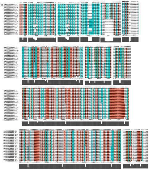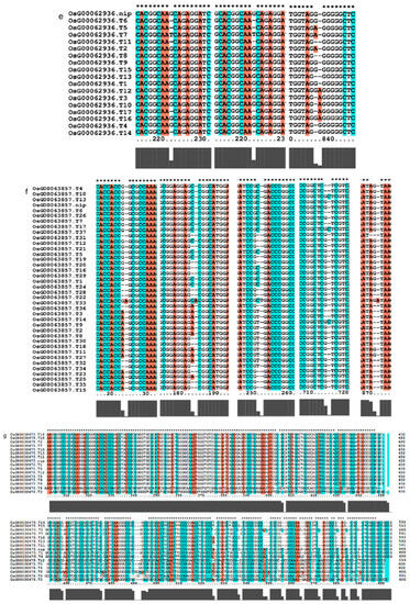 Gene alignment in the regulatory network analysis of the AP2 gene family. * showed all the bases at this site are identical. The genes (a) The results of gene OsCLT1 blast. (b) The results of gene OsCRT3 blast. (c) The results of gene OsAP23 blast. (d) The results of gene OsRap2.6 blast. (e) The results of gene OsDREB1E blast. (f) The results of gene OsAP2-39 blast. (g) The results of gene OsAP211 blast.