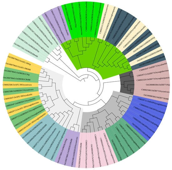 The phylogenetic tree of upstream genes in the AP2 gene family across different rice species is presented in the diagram. The tree was generated using the neighbor-joining method with bootstrap sampling (1000 replicates) and MEGA software version 11. The same color represents the same gene in six rice species.