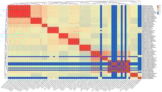 The percentage identity matrix analysis of upstream genes in the AP2/EREBP gene family is presented in the diagram. The gene names are shown on the upper and lower sides of the matrix. The redder the color in the figure, the higher the degree of similarity, while the bluer the color, the less similar.