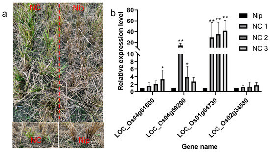 (a) Recombinant inbred lines from Nipponbare crossing with Chaling wild rice in winter; (b) results of expression level of AP2 signaling pathway genes in recombinant inbred lines from Nipponbare crossing with Chaling wild rice. The error bars in the figure represents the mean ± standard error, * represents the difference, p < 0.05, and ** represents the significant difference, p < 0.01.