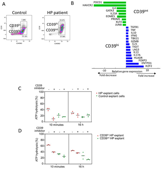 Figure 3A). CD39hi and CD39int cells were sorted via flow cytometry using digested explants from the HP patient and subjected to 2.5 h of stimulation in culture. qPCR was employed to measure gene expression in the CD39hi cell population relative to the CD39int cell population (gating for sorting shown in