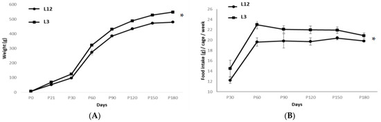 (A) Body weight gain over 6 months until sacrifice of control (n = 12) and overfed rats (n = 9) and (B) respective mean amount of food intake per cage. Values are represented as Mean ± SD. * p < 0.05 vs. L12.