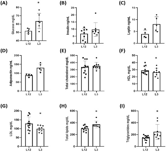 Serum glucose levels were significantly upregulated in overfed rats compared to controls, whereas insulin levels were unchanged between experimental groups (Figure 2A,B) (p < 0.05). Leptin (Figure 2C) and adiponectin (Figure 2D) circulating levels were significantly increased in the serum of L3 rats. Regarding lipid profile, total cholesterol serum levels remained unchanged (Figure 2E) when L3 and L12 groups were compared; meanwhile, c-HDL (Figure 2F) and c-LDL (Figure 2G) were significantly lower in overfed rats compared to controls. However, the serum levels of total lipids (Figure 2H) and triglycerides (Figure 2I) were significantly increased in rats from L3 in comparison to rats from L12.
