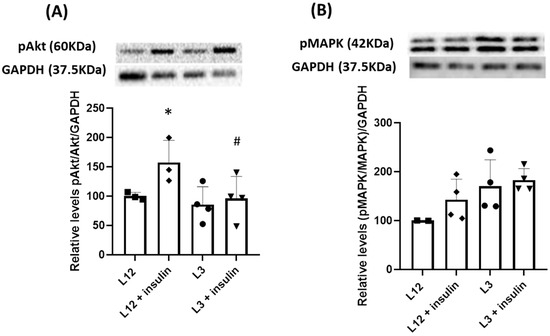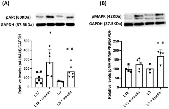 Relative quantification of activation, measured as phosphorylated protein vs. total protein, in myocardium tissue in response to insulin in Akt pathway (A) and MAPK pathway (B). *, p < 0.05 vs. basal; #, p < 0.05 vs. L12 + insulin.
