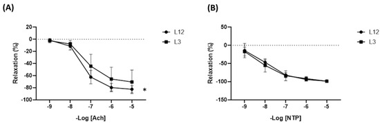 Relaxation curves in response to increasing concentrations of acetylcholine (Ach) (A) and nitroprusside (NTP) (B) in aortic rings from both L12 and L3 rats. * p < 0.05 vs. L12.