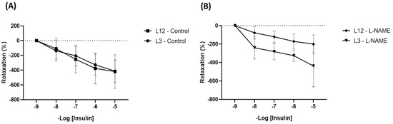 Furthermore, in order to assess insulin resistance in the aorta, the vascular reactivity of aorta segments from L12 and L3 rats was also performed in response to increasing concentrations of insulin. No statistical differences were observed when comparing both groups (Figure 6A), but after preincubation with L-NAME, L12 segments showed decreased relaxation in response to insulin, whilst L3 aortic segments did not (Figure 6B). This implies the molecular pathway involved in the vasodilatory aortic response to insulin in control rats is related to nitric oxide; meanwhile, segments from overfed rats may comprise another one that is not NO-dependent. Several experiments using other blockers were also performed in order to assess the molecular pathways responsible for this difference, but no significant results were obtained.