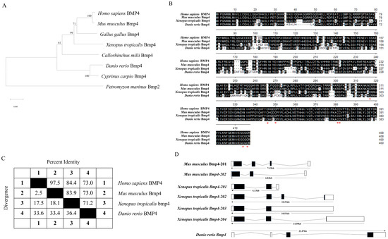 The gene of zebrafish bmp4 was acquired from the Ensembl database (Ensembl: ENSDARG00000019995, http://www.ensembl.org, accessed on 10 May 2021). This gene has one transcript encoding a protein of 400 amino acids. By searching in the National Center for Biotechnology Information (NCBI) genome database (https://www.ncbi.nlm.nih.gov/, accessed on 10 May 2021), we found that orthologs of this gene were present in mammals, birds, amphibians, teleosts and cartilaginous fish (see Figure 1 legend for the gene source information). The phylogenetic tree based on the amino acid sequences of these BMP4 proteins showed that the BMP4 molecules of mammals, birds and amphibians may have evolved from fish BMP4 (Figure 1A). The comparison of the amino acid sequences, exon–intron organizations and three-dimensional (3D) structures among them showed that they are very similar (Figure 1B–D and Figure 2A). Apparently, the sequences of their maturation peptides have the highest identity (Figure 1B). They all contain seven cysteine residues in their C-terminal (Figure 1B). In addition, the bmp4 loci in D. rerio are adjacent to the genes ddhd1a and fermt2, which resemble the BMP4 regions of other species (Figure 2B). Both the order and direction of these genes are similar among these species, indicating the synteny-encompassing BMP4 region during vertebrate evolution.