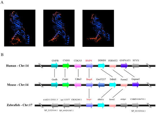 Comparison of the 3-D structure of BMP4 proteins and the loci of BMP4 genes in different species. (A) The three-dimensional structures of D. rerio Bmp4, H. sapiens BMP4 and M. musculus Bmp4. This diagram was generated using SWISS-MODEL online software (https://swissmodel.expasy.org/, accessed on 2 July 2023). (B) Synteny map of the genomic segment with BMP4 genes in different species. Genes are represented by boxes. Transcription direction is indicated by arrow.