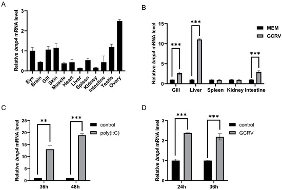 We first detected the distribution of bmp4 mRNA in tissues of adult zebrafish through quantitative reverse-transcription PCR (qRT-PCR) technology. It was found that zebrafish bmp4 mRNA was expressed in all the detected tissues (Figure 3A), implying multiple functions of this gene. Obviously, bmp4 had the higher expression in the tissues of the ovary, testis, skin, gill and eye (Figure 3A). Then, the expression of bmp4 upon virus infection was measured in the immune-related tissues including the gill, liver, spleen, kidney and intestine in zebrafish. After 24 h of stimulation with GCRV (a dsRNA virus), the expression of bmp4 in the tissues of the gill, liver and intestine was significantly increased (Figure 3B). The in vitro effect of GCRV or poly(I:C) challenge on bmp4 expression was also detected in zebrafish liver (ZFL) cells. GCRV or poly(I:C) significantly elevated the expression of bmp4 in ZFL cells (Figure 3C,D). These suggest that the expression of bmp4 is induced by infection with virus or its mimic poly(I:C).