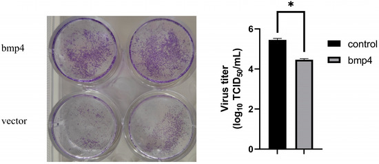 Antiviral function of Bmp4 in vitro. Overexpressing bmp4 significantly decreased the viral titers in EPC cells. EPC cells were transfected with bmp4 or empty vector, and 24 h later, the cells were infected with GCRV (106 TCID50/mL). The cells and culture supernatants were collected 24 h post infection and the viral titers were determined through TCID50 assays. Data were analyzed using Student’s t-test (two-tailed) and are presented as mean ± SD (* p < 0.05).