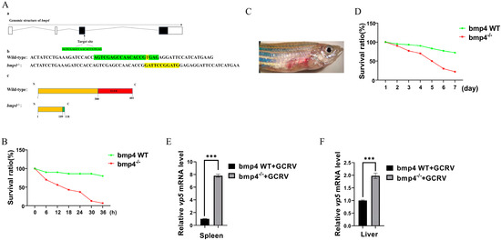 We then explored the role of zebrafish Bmp4 in antiviral immunity. The wild-type EPC cells and EPC cells over-expressing bmp4 were infected with GCRV virus. We found that, after 24 h of GCRV stimulation, a significant decrease in viral titers was observed in the EPC cells overexpressing bmp4 (Figure 4). In addition, the CRISPR-Cas9 technology was used to generate bmp4-deficient (bmp4−/−) zebrafish, in which 1 nucleotide was replaced by 11 nucleotides in exon 3 of bmp4, leading to early termination of translation to the 118th amino acid (Figure 5A). The bmp4 knockout zebrafish (bmp4−/−) can survive, reproduce and breed normally under standard laboratory conditions. To study the function of Bmp4 in antiviral immunity in vivo, the wild-type and bmp4−/− zebrafish larvae were infected by adding GCRV in the embryo culture medium. Compared with wild-type zebrafish, bmp4−/− zebrafish larvae exhibited a significantly reduced survival rate upon GCRV infection, and most of the fish died 36 h post infection, while only few wild-type zebrafish died during the period (Figure 5B). Moreover, the adult zebrafish were infected with the virus of GCRV (Figure 5C). After infection with GCRV, the survival rate of bmp4−/− zebrafish was significantly reduced (Figure 5D). Also, the levels of virus RNA of GCRV in the liver and kidney of bmp4−/− adult zebrafish were significantly increased compared to those of wild-type zebrafish (Figure 5E,F). These data suggest that Bmp4 plays a role in the host defense against virus infection.