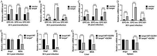 Bmp4 promotes the expression of antiviral genes. (A,B) Expression of EPC ifn and EPC mx mRNA after transfection with bmp4 (2 μg) or empty vector (2 μg) in EPC cells. The cells were collected 24 h or 36 h post transfection. (C,D) Expression of EPC ifn and EPC mx mRNA after transfection with bmp4 (2 μg) or empty vector (2 μg) in EPC cells for 24 h, followed by infection with GCRV for another 24 h or 48 h. (E,F) Expression of ifnφ1 and mxa mRNA from WT or bmp4−/− zebrafish larvae challenged with GCRV for 24 h or 36 h. (G,H) Expression of ifnφ1 and mxa mRNA in the liver and spleen from WT or bmp4−/− adult zebrafish challenged by injecting i.p. with 40 µL of GCRV (2.5 × 107 TCID50/mL) for 36 h. The expression of zebrafish actb1 or EPC actin was used as an internal control for the qRT-PCR. Data were from three independent experiments and were analyzed using Student’s t-test (two-tailed) for comparison of two groups. All data are presented as mean ± SD (** p < 0.01, *** p < 0.001, **** p < 0.0001).