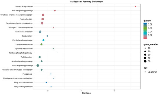 KEGG analysis of the pathways through enrichment of DEGs between bmp4−/− and WT liver tissue of zebrafish challenged by GCRV. Rich factor is the ratio of differentially expressed gene numbers annotated in these pathway terms to all gene numbers annotated in these pathway terms. The q-value means corrected p-value; q < 0.05 is significantly enriched.