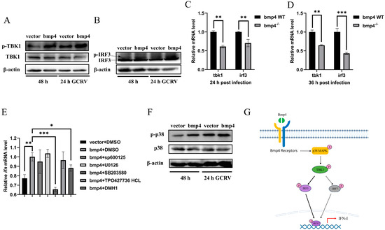 Bmp4 increases Tbk1-Irf3 antiviral signaling via p38 MAPK pathway. (A,B) Immunoblot analysis of phosphorylated (p-) Tbk1 (A) and Irf3 (B) was performed 24 h after transfection of 2 μg of bmp4 or empty vector in EPC cells, followed by infection with or without GCRV for 24 h. (C,D) Expression of tbk1 and irf3 mRNA from WT or bmp4−/− zebrafish larvae challenged with GCRV. (E) Expression of EPC ifn mRNA 24 h after transfection of bmp4 (2 μg) in EPC cells, followed by treatment with SB203580, SP600125, U0126, DMH1 and TP0427736 HCl for 24 h. (F) Representative Western blot analysis in p-p38 MAPK expression in bmp4-overexpressed EPC cells. (G) Schematic illustration of the regulation of Bmp4 in the antiviral immune response. The Bmp4 promotes phosphorylation of Tbk1 and Irf3 to induce the expression of ifn through p38 MAPK pathway. The expression of zebrafish actb1 or EPC actin was used as an internal control for the qRT-PCR. Data were from three independent experiments and were analyzed through Student’s t-test (two-tailed) for comparison of two groups or one-way ANOVA followed by Games-Howell post hoc tests for comparison of multiple groups. All data are presented as mean ± SD (* p < 0.05, ** p < 0.01, *** p < 0.001).
