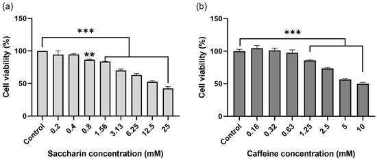 Ovcar-3 cells were treated with saccharin or caffeine for 24 h, and the cell viability was confirmed via a WST-8 assay. When cells were treated with saccharin by concentration, the survival rate of Ovcar-3 cells decreased in a concentration-dependent manner compared to the cells not treated with saccharin, and a statistically significant decrease (p < 0.001) was confirmed (Figure 1a). Furthermore, among the Ovcar-3 cells treated with caffeine, the cell viability decreased in a concentration-dependent manner compared to the cells not treated with caffeine, and a statistically significant decrease (p < 0.001) was confirmed (Figure 1b).