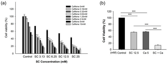 The effect of saccharin (SC) with caffeine (CA) on cell viability among Ovcar-3 cells. (a) The combination effects of concentrations of saccharin (3.13, 6.25, 12.5, 25 mM) and caffeine (2.5, 5, 10 mM). (b) The combination effects of saccharin (12.5 mM) with caffeine (5 mM) on cell viability among Ovcar-3 cells. Each experiment was performed in triplicate; *** p < 0.001.