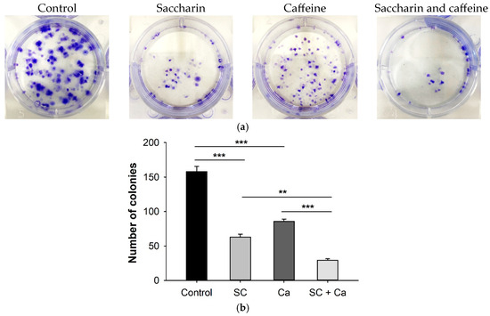 Ovcar-3 cells were cultured for 24 h at a concentration of 1 × 103 cells/well in a 6-well plate. After incubation for 24 h, cells were treated with saccharin and caffeine alone and in combination for 24 h. After treatment, they were washed and incubated at 37 °C and 5% CO2 concentration for 14 d. Cells were washed with phosphate buffered saline (PBS) and fixed for 5 min at a methanol:acetic acid ratio of 3:1. Then, they were stained with 0.5% crystal violet dye for 15 min. The stained colonies were then washed with tap water, and the colonies were counted using ImageJ 1.49 software (U.S. National Institutes of Health, Bethesda, MD, USA).