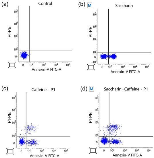 The Ovcar-3 cells were cultured for 24 h at a concentration of 3 × 105 cells/well in a 6-well plate. Cells were treated with saccharin and caffeine alone and in combination in the concentration range determined to be synergistic with the CI index value for 24 h. After washing with PBS, cells were collected via trypsin treatment and centrifuged. The supernatant was removed and treated with 1× binding buffer (Invitrogen, Carlsbad, MA, USA). Then, cells were treated with annexin V-FITC (Invitrogen) and pipetted, followed by reaction in the dark for 10 min. After reacting with annexin V-FITC for 10 min, they were washed with 1× binding buffer and, after centrifugation, only cells were left. Then, 1× binding buffer was added to react with PI-PE (20 μg/mL). Cells stained with annexin V-FITC and PI-PE were analyzed using a flow cytometer FACSCalibur™ (BD, Franklin Lakes, NJ, USA). The analysis of the results was performed using FlowJo 10.5.3 software (Tree Star Inc., Ashland, KY, USA).