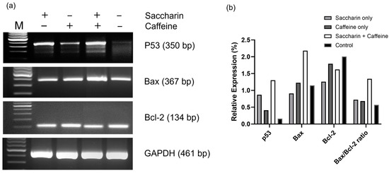 (a) The results of the RT-PCR analysis following treatment with saccharin and caffeine alone or in combination. (b) The relative mRNA expression levels of p53, BAX, Bcl-2 genes, and the BAX/Bcl-2 ratio. The RT-PCR products obtained from all groups were separated via 2% agarose gel electrophoresis with 100 ng/mL of ethidium bromide.