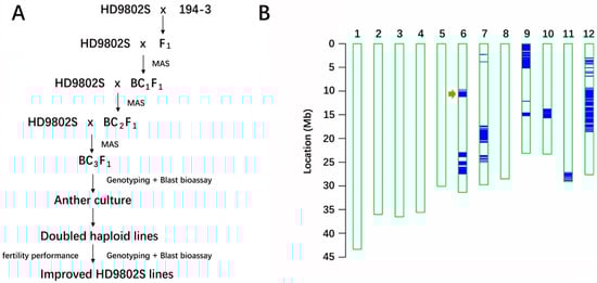 The TGMS line HD9802S was bred by Hubei University [,]. Male sterile plants were found in the F2 segregated populations of Huda51 and Hongfuzao, which were bred into HD9802S by genealogical low temperature selection and artificial climate box identification. Through identification of rice blast in the field, it was found that the rice blast of HD9802S was at level 5 and the variety was highly susceptible to rice blast [,]. In the early stages of this study, under natural field-induced conditions, the blast resistance gene R6 was identified using a recombinant inbred line constructed from the high-rice-blast-resistant cultivar 194-3 and the rice-blast-susceptible cultivar Zhenshan97B [,]. R6 is located on chromosome 6 and encodes the entire growth period of the rice-blast-resistance gene []. In the present study, the R6 gene was introduced into HD9802S through conventional hybridization and then backcrossed to construct BC3F1. By combining MAS, gene chips, AC, and field identification of rice blast resistance to select target genes, HD9802S was further improved to enhance rice blast resistance.