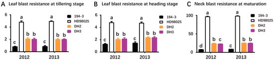 Phonotypes of improved lines and controls for rice blast under natural infection conditions Shown were the average values for leaf blast resistance at tillering (A) and heading (B) stages and neck blast resistance at maturation (C) of 194-3, HD9802S, DH2, and DH3 in 2012 and 2013. Phenotypic statistical data were expressed as mean ± standard deviation (SD), n = 24. Letters above the bars are ranked by the Duncan test at p < 0.05; different letters next to SD bars indicate a significant difference.