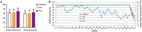 Fertility performance for the plants of HD9802S, DH2, and DH3 (A) Pollen fertility and bagging seed setting rates of HD9802S, DH2, and DH3 (n = 24). Letters above the bars are ranked by the Duncan test at p < 0.05; same letters next to SD bars indicate no significant difference. (B) Dynamic pollen fertility expressions of HD9802S, DH2, and DH3 relative to daily mean temperature (DMT) data from July 1 to September 30, 2012 (92 days in total) in Wuhan (n = 12).