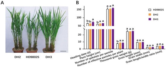Performance of the main agronomic and rice grain quality traits of HD9802S, DH2, and DH3 Plant type. (A) and agronomic and rice grain quality traits Scale bar, 9.5 cm. (B) of HD9802S, DH2, and DH3. Phenotypic statistical data are expressed as mean ± SD, n = 24. Letters above the bars are ranked by the Duncan test at p < 0.05; different letters next to SD indicate a significant difference.