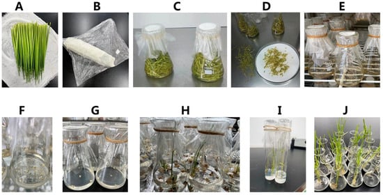 Steps of rice anther culture. (A) Rice young panicle collection and early treatment (B) Preparation of rice young panicle pre-treatment at low temperature (C) The screened young rice panicles were disinfected. (D) The screened rice spikelets were treated with hull cutting. (E) Rice anthers were inoculated on induction medium. (F) Rice anther-induced callus (G) The rice anther callus was differentiated. (H) The rice anther callus differentiated into green and white seedlings. (I) Green rice seedlings of anther culture (AC) for rooting (J) Green rice seedlings after AC were refined.