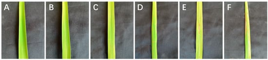 The green plants cultivated in AC were numbered according to the differentiation source of calli and were planted in the blast resistance identification base in Yuan’an, which is an area that experiences a high incidence of rice blast [,]. The rice blast inspection method was based on previously reported standards []. Leaf blasts were graded using a 0–5 level scoring system, with levels 0–3 indicating resistance and levels 4 and 5 indicating susceptibility (Figure 6). The newly grown leaves of 10 individual plants in the middle of each line were examined by stage, and the most serious disease spots on the leaves were registered as leaf blast phenotypic values of this plant. Leaf blasts were investigated every 30 d during the tillering and heading stages, and neck blasts were evaluated 1 week before the maturity stage. The severity of the neck blast was recorded as the percentage of rice-spiked neck infections at physiological maturity. The number of infected plants showing the neck blast phenotype was expressed as a percentage of infection. Percentage resistance grading was used for neck blast, with rice blast rates from 0% to 25% indicating resistance and those from 26% to 100% indicating susceptibility.