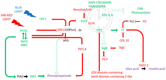 - Shin, J.; Park, E.; Choi, G. PIF3 Regulates Anthocyanin Biosynthesis in an HY5-Dependent Manner with Both Factors Directly Binding Anthocyanin Biosynthetic Gene Promoters in Arabidopsis: Functional Relationship between PIF3 and HY5. Plant J. 2007, 49, 981–994. [Google Scholar] [CrossRef] [PubMed]