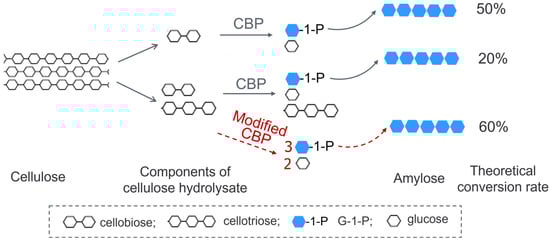 A schematic diagram showing the advantage of a modified CBP with broadened substrate specificity in the conversion of cellodextrin to starch.