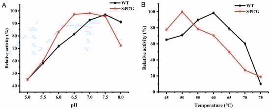 The S497G variant showed an optimal pH of 7.0, slightly lower than that of the wild type (pH 7.5), while the optimal temperature was found to be 50 °C, lower than that of the wild type (60 °C) (Figure 3). It is noteworthy that one site mutation markedly decreased the enzyme’s thermostability, although the enzyme was stable under 50 °C with 80% of initial activity remaining after 50 min of incubation. From the perspective of application, 50 °C could satisfy the majority of application scenarios that CBPs are involved in. Therefore, the decreased optimal temperature may not affect the application of S497G.