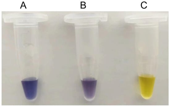 Detection of amylose formation in mixed cellodextrin system using iodine/potassium iodide solution. (A) S497G variant; (B) Wild type CtCBP; (C) Distilled water instead of reaction mixture.