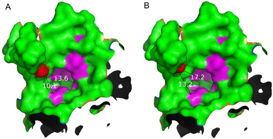 Analysis of the shape and size of the entrance of the substrate-binding pocket of the WT (A) and S497G variant (B). The mutation site S497 is marked in red. The dotted lines with values (unit: Å) represent the distances between site 497 to Gln699 and site 497 to Arg355 in the entrance of the substrate-binding pocket, respectively.