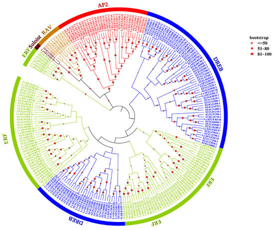Phylogenetic analysis of LrAP2/ERFs in Lycoris. The phylogenetic tree is constructed via the NJ method on the basis of the alignment of AP2/ERF domains. Only the percentages of replicate trees greater than 50 are shown on the branches, and these values are calculated by bootstrap tests (1000 replicates) for reliability verification. The tree shows the five subfamilies highlighted in different colors.