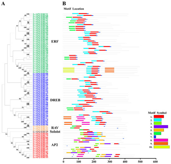 Phylogenetic relationships and conserved motif analysis of LrAP2/ERF proteins. (A) Neighbor-joining phylogenetic tree of LrAP2/ERF (bootstrap values for 1000 replicates). (B) Distribution of conserved motifs in LrAP2/ERF proteins. The colored boxes represent different motifs. The box length represents motif length.