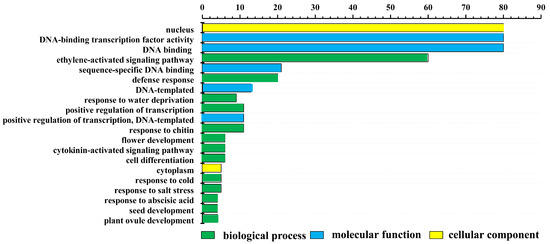 To further characterize the functions of LrAP2/ERF transcription factors, all LrAP2/ERFs were subjected to GO annotation and enrichment analysis. The LrAP2/ERF transcription factors were classified into 93 different functional categories and grouped as per the following three ontologies: biological processes (BPs), cellular components (CCs), and molecular functions (MFs). At level two, the top 20 GO terms were ranked and visualized (Figure 3). In CC terms, the nucleus contained 80 of the LrAP2/ERF proteins, whereas the cytoplasm, cytosol, and plasma membrane only contained a few of these proteins. In MF terms, it was determined that 80 LrAP2/ERF proteins exhibited DNA-binding TF activity (Figure 3). In BP terms, the ethylene-activated signaling pathway was linked to 60 LrAP2/ERF proteins. Significant enrichment of target genes in GO terms was observed in response to abscisic acid, cold stress, salt stress, water deprivation, the cytokinin-activated signaling pathway, flower development, seed development, and plant ovule development.