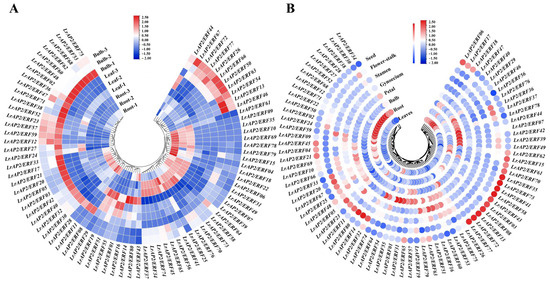 Expression analysis of LrAP2/ERF genes across different tissues. (A) Expression profile heatmap with hierarchal clustering of LrAP2/ERFs at different developmental stages of Lycoris longituba. Samples were obtained from the roots, leaves, and bulbs of 4-year-old plants. (B) LrAP2/ERFs gene expression profiles at different developmental stages of L. radiata. The relative expression for each gene is depicted by color intensity in each field. Higher values are represented by red, whereas lower values are represented by blue.