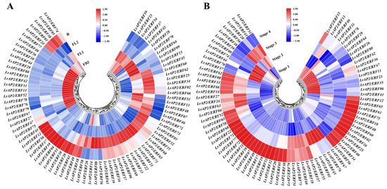 Expression profile with hierarchal clustering of LrAP2/ERFs during flower developmental stages. (A) Gene expression profiles of LrAP2/ERFs at different flower developmental stages of L. radiata. (B) Expression profile heatmap with hierarchal clustering of LrAP2/ERFs at different flower developmental stages of L. longituba. The relative expression for each gene is depicted by color intensity in each field. Higher values are represented by red, whereas lower values are represented by blue.