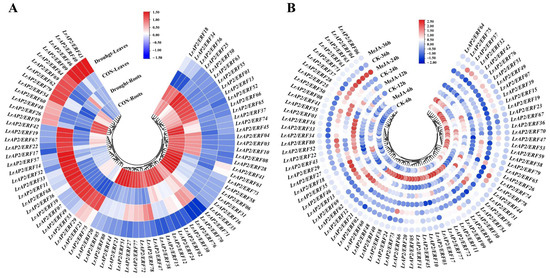 LrAP2/ERF gene expression profiles under drought stress and MeJA treatment. (A) Heatmap with hierarchical cluster analysis of drought-responsive differentially expressed LrAP2/ERF genes. (B) Heatmap of LrAP2/ERF gene expression profiles with MeJA treatment. Red and blue represent high and low relative transcript abundance, respectively.