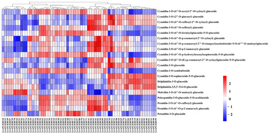 The Pearson’s correlation coefficients of LrAP2/ERFs with anthocyanin biosynthesis metabolites. Higher values are represented by red, whereas lower values are represented by blue.